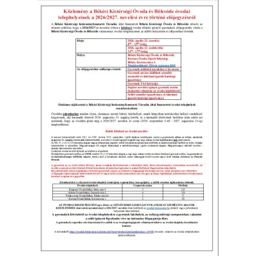A Békési Kistérségi Intézményfenntartó Társulás által fenntartott Békési Kistérségi Óvoda és Bölcsőde értesíti az érintett szülőket, hogy a 2026/2027-es nevelési évben a kötelező óvodai ellátást igénylő gyermekek előjegyzésbe vétele a Békési Kistérségi Óvoda és Bölcsőde valamennyi óvodai telephelyének az alábbi helyszínen és időpontban történik.